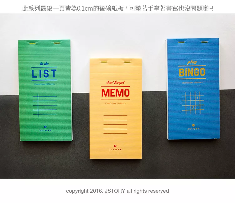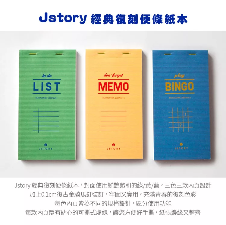 Jstory 經典復刻便條紙本,封面使用鮮艷飽和的綠/黃/藍,三色三款內頁設計